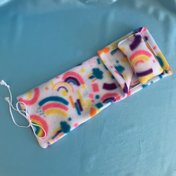 Soft fleece sleeping bag set for Barbie sized dolls in a Rainbow print.